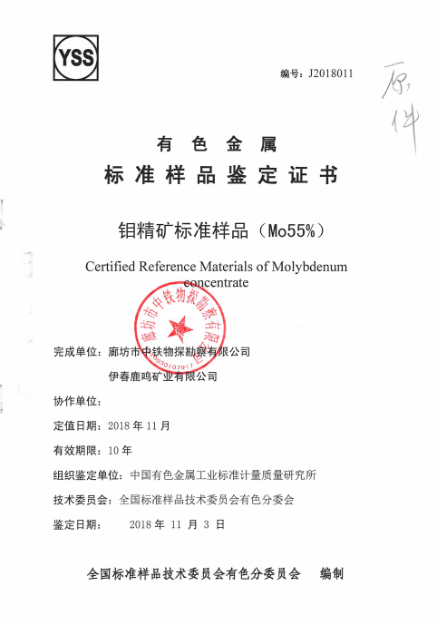 鉬精礦國家標準樣品鑒定證書及實物