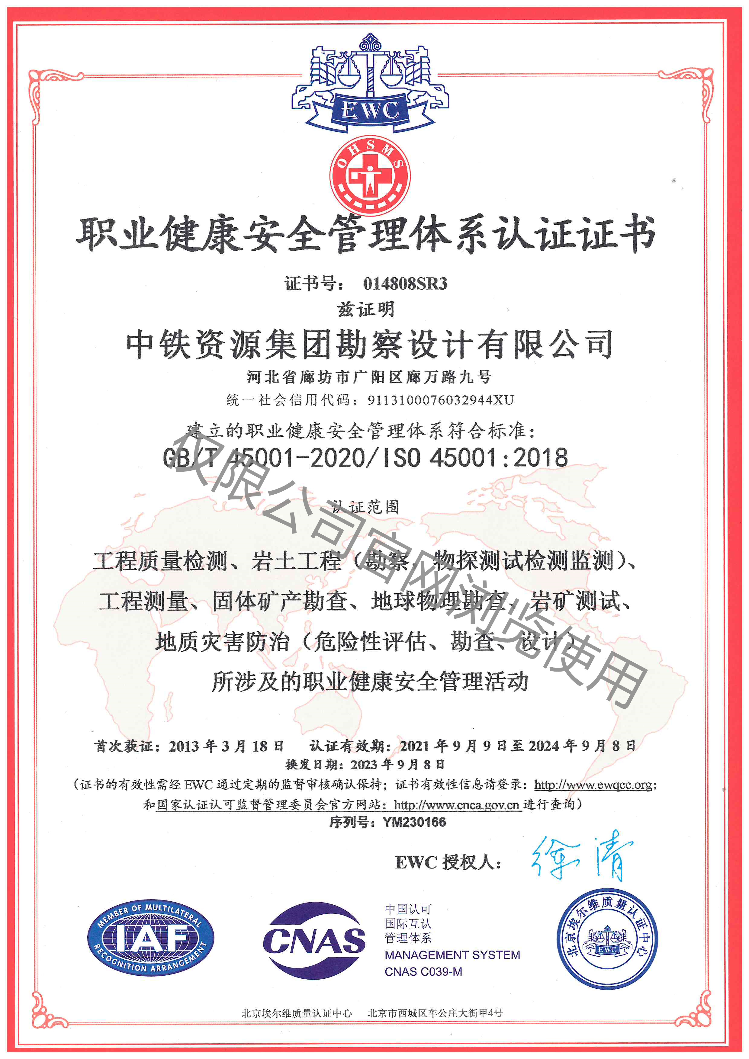職業健康安全管理體系認證證書